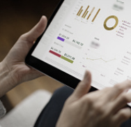 A person holds a tablet displaying various data visualizations, including bar charts, a pie chart, and line graphs, representing financial or business analytics.