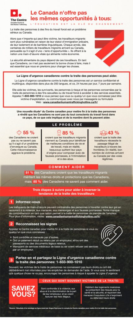« Des promesses d’emplois bien rémunérés et d’accès à des opportunités pour elles-mêmes et leurs familles attirent les victimes de la traite de personnes vers le Canada. Cependant, lorsqu’elles arrivent ici, elles sont contraintes de travailler de longues heures dans des conditions de travail précaires et dangereuses et ce, pour peu ou pas d’argent », explique Julia Drydyk, directrice exécutive du Centre canadien pour mettre fin à la traite de personnes. « Dans bien des cas, ces travailleurs ne réalisent pas qu’ils ont des droits. Beaucoup se sentent menacés et isolés, alors ils font ce qu’on leur dit. Nous savons que les Canadiens veulent aider – 93 % d’entre eux sont favorables au traitement équitable des travailleurs migrants – mais nous savons aussi que 85 % ne savent pas comment poser des gestes concrets. La capacité d’identifier la traite de personnes constitue une première étape essentielle pour l’arrêter. »