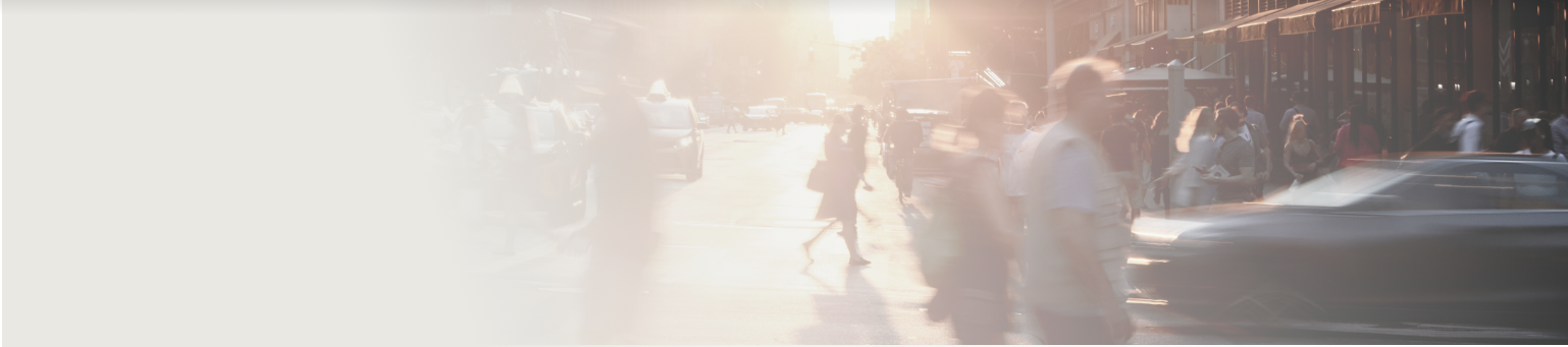 A city street scene at sunset shows blurred silhouettes of people crossing the road and cars driving by, with a sunlit background and buildings along the right side. The left side of the image fades into a light gradient.