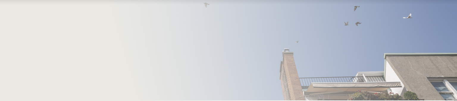 A few birds fly in a clear blue sky above the partial view of a building with a balcony and a brick chimney, framed on the right side of the image.